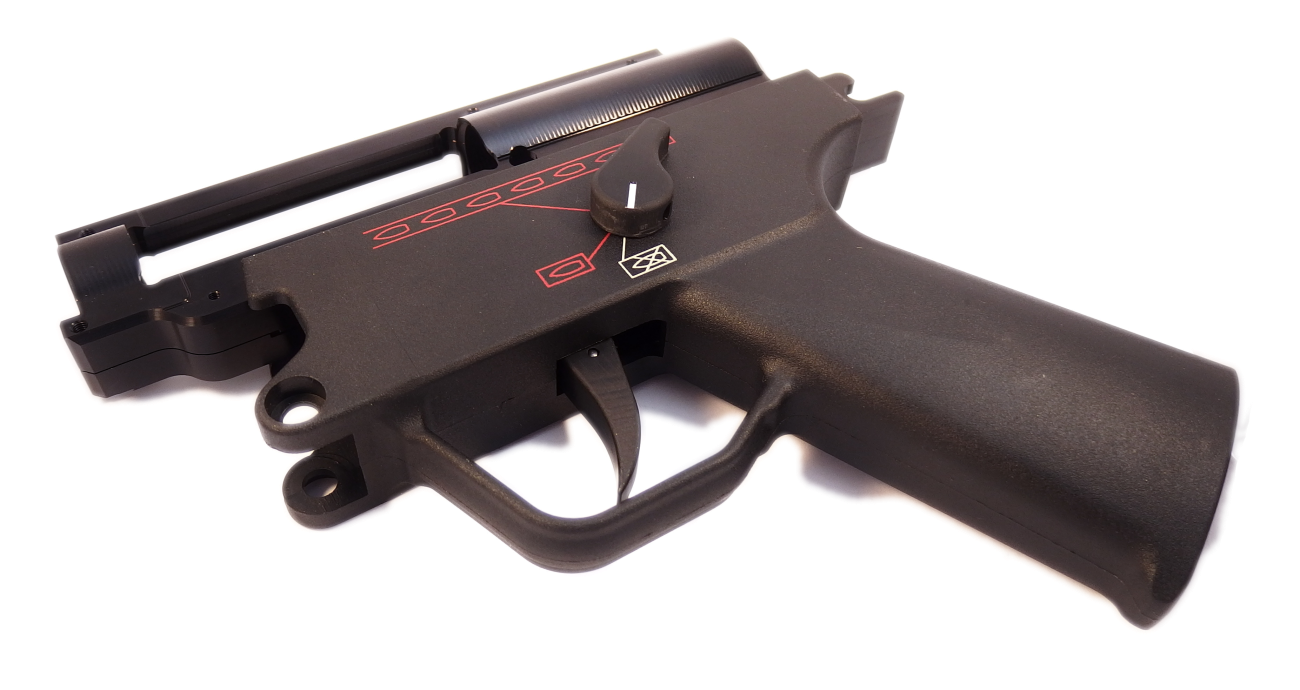 - Curved CNC black trigger with installed extension for MP5 airsoft weapons
